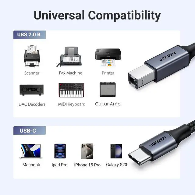 USB C Printer Cable & MIDI Cable: This USB B to USB C printer cable supports connected printers, scanners, fax machines, as well as most audio equipment. Connect to keyboards, guitar amps, DAC converters, and DJ controls.