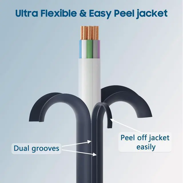 Easy Peel Jacket: The ultra-flexible frosted PVC jacket not only protects the internal wires, but also provides maximum flexibility for installations that require a lot of twists and turns.