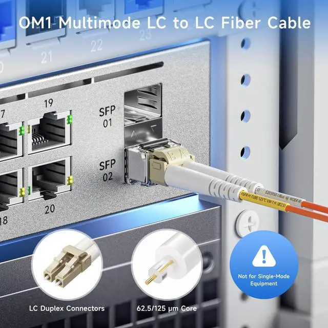 High-Density OM1 Fiber Connectivity: Multimode duplex 62.5/125 µm fiber cables with dual small-form-factor LC connectors are designed for high-density applications in network closets and data centers. This OM1 LC to LC fiber patch cable supports LED-based network equipment such as SFP and GBIC transceivers, media converters, industrial Ethernet devices, and optical fiber NICs, and provides premise connections for patch panels, outlets, cross-connects, and fiber distribution systems.