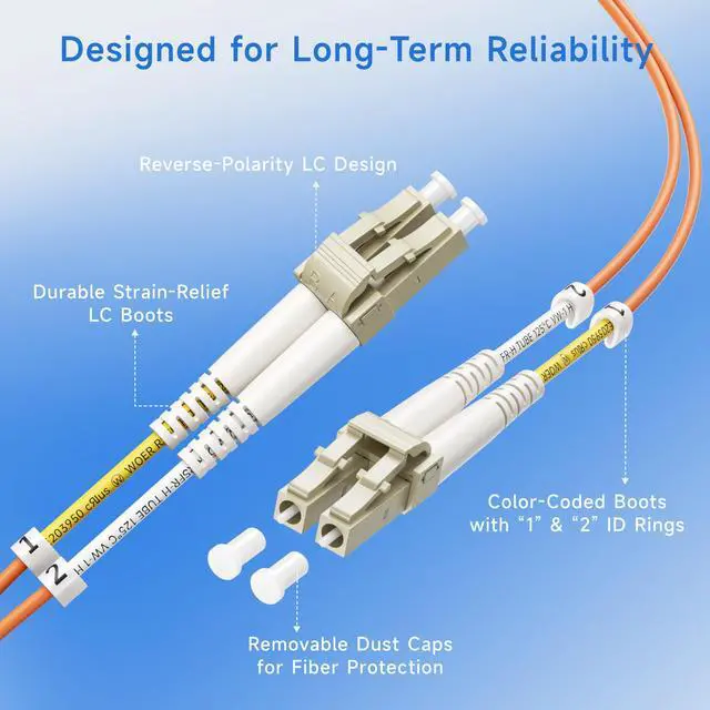 Fast & Convenient Installation: Lightweight fiber optic patch cords include removable dust caps that protect LC connectors during installation. Adjustable connector clips allow individual fiber access, while embossed A/B labels and jacket tag rings labeled 1 and 2 offer quick identification of Tx and Rx when installing, testing, or troubleshooting network connections.