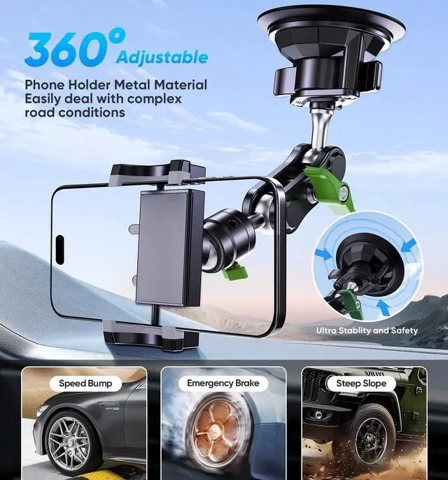 Car Phone Holder, Ultra-Durable Mteal Phone Holders for Your Car, 360° Rotation Cell Phone Car Mount for Windshield, Suction Cup Car Phone Mount for iPhone Samsung All Smartphone