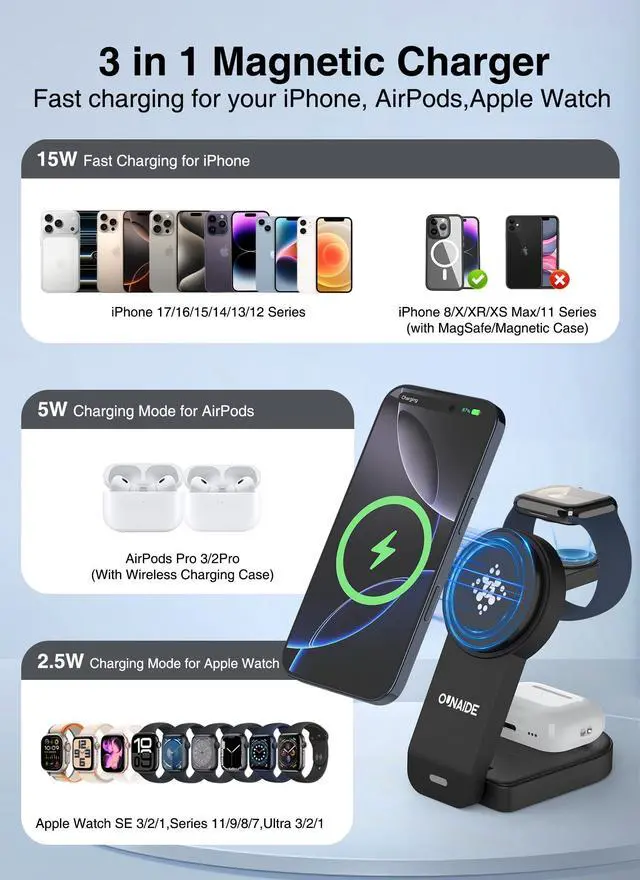 | Model Name | [For iPhone]: iPhone 17/ Air/17 Pro/17 Pro Max/iPhone 16 / 16 Plus / 16 Pro / 16 Pro Max / iPhone 15 / 15 Plus / 15 Pro / 15 Pro Max / iPhone 14 / 14 Plus / 14 Pro / 14 Pro Max / iPhone 13 / 13 mini / 13 Pro / 13 Pro Max / iPhone 12 / 12 mini / 12 Pro / 12 Pro MaxiPhone 16 / 16 Plus / 16 Pro / 16 Pro Max / iPhone 15 / 15 Plus / 15 Pro / 15 Pro Max / iPhone 14 / 14 Plus / 14 Pro / 14 Pro Max / iPhone 13 / 13 mini / 13 Pro / 13 Pro Max / iPhone 12 / 12 mini / 12 Pro / 12 Pro Max[For Apple Watch]: for iWatch S11 /10 /9/ 8 / 7 / 6 / 5 / 4 / 3 / 2 / SE / Ultra 3(Note: Only for Apple Watch, not for Samsung or other Watch); [For Airpods]: AirPods 2 / 3 / Pro / Pro 3 2 (Note: Airpods 2/3 require wireless charging case) |