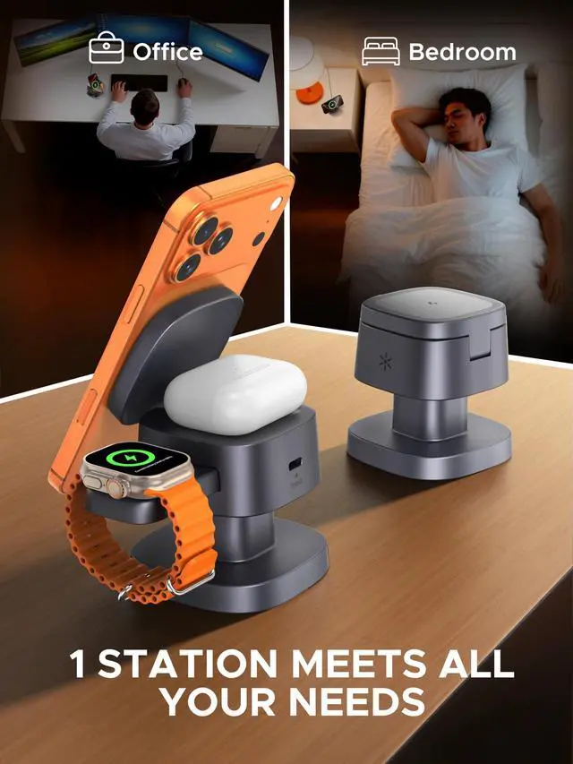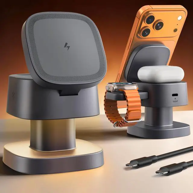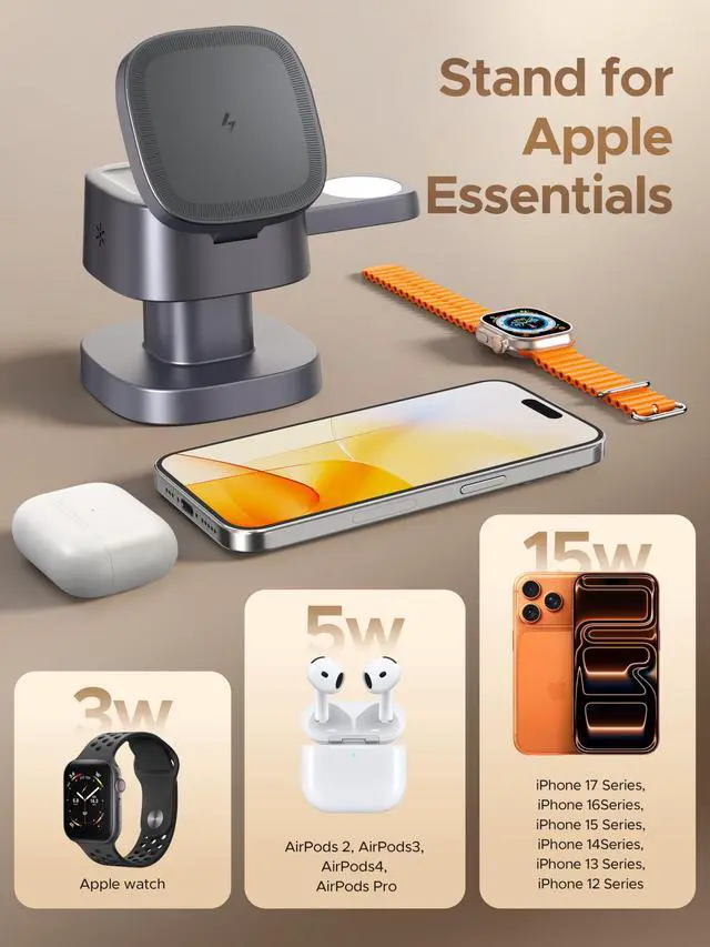| Compatible Devices | AirPods 2/3/4 (with Wireless Charging Case)AirPods ProAirPods Pro 2, Apple Watch Ultra/Ultra 2/10/9/8/7/SE/6/5/4/3 4, iPhone 17 / 17 Air / 17 Pro / 17 Pro Max; iPhone 16 / 16 Plus / 16 Pro / 16 Pro Max; iPhone 15 / 15 Plus / 15 Pro / 15 Pro Max; iPhone 14 / 14 Plus / 14 Pro / 14 Pro Max; iPhone 13 / 13 mini / 13 Pro / 13 Pro Max; iPhone 12 / 12 mini / 12 Pro / 12 Pro Max |