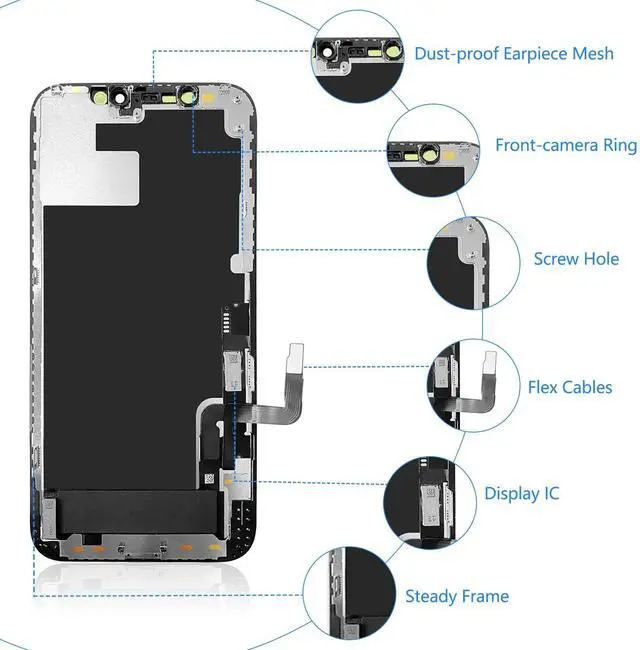 KIND NOTE: this iPhone 12/12 Pro LCD screen came with the back metal plate and camera holder, but DOESN'T INCLUDE the front camera, ear-speaker and sensors, you have to transfer them from your original screen.