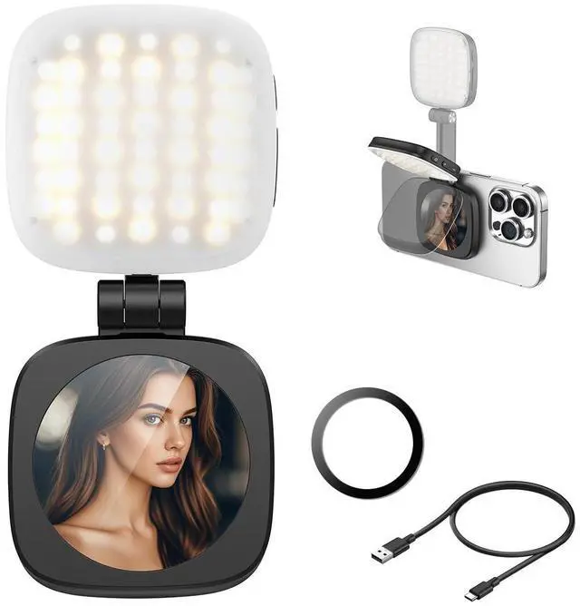 Magnetic Selfie Light with MirrorXO mini filling light is compatible with MagSafe and has a strong magnetic force, which can be firmly attached to magnetic mobile phones. Equipped with 48 LED lights and 5 adjustable lights,brighten skin and illuminate your beauty. Easy to carry and foldable,it is the perfect choice for makeup,travel,vlogging,or on-the-go photography.