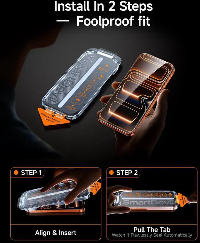 : This is the easiest method for installing iPhone screen protector available on the market to date. It features innovative automatic positioning, dust removal, and adsorption technology, making the installation a breeze within seconds. Simply align the frame on your phone, press and pull. With a success rate as high as 99.99%