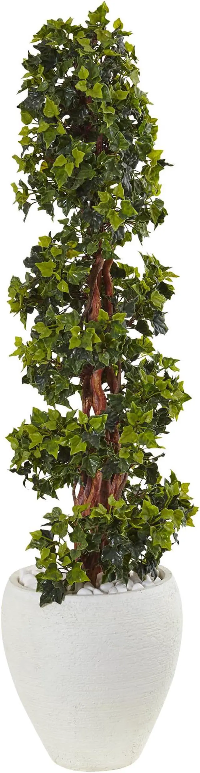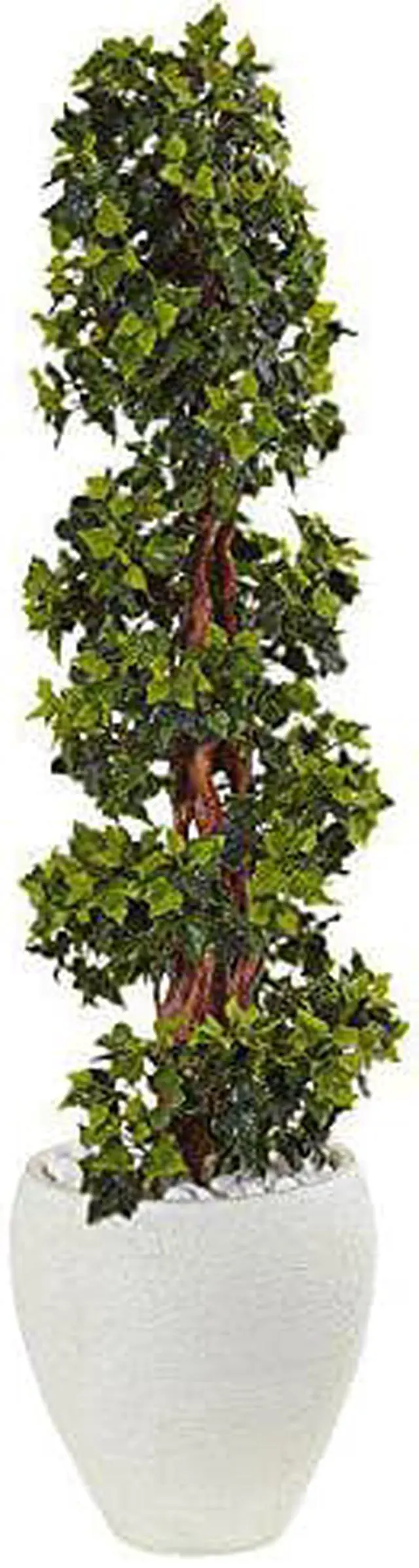 Enjoy the timeless beauty of a spiral cut faux English ivy topiary tree that looks like it took years to train and grow. You'll never believe it's not the real thing. A pair of these makes a grand statement in any entryway or conference room. Comes in a textured white oval planter with river rocks included so it will match with any decor.