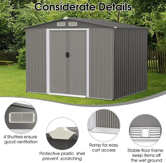 Multiple Humanized Details: Including 4 louvers, this garden storage room will keep items dry with excellent ventilation. Besides, an additional foundation can also protect your items from wet floors. Moreover, there are convenient sliding door and built-in ramp to facilitate access for large tools.