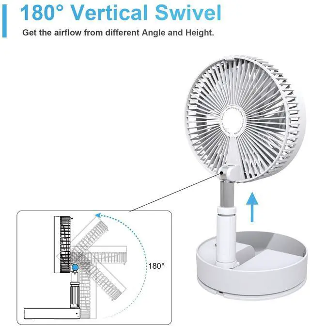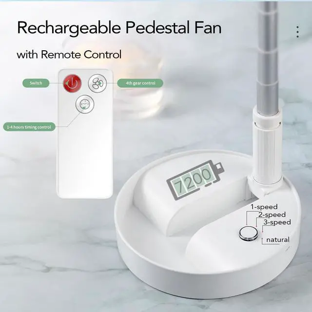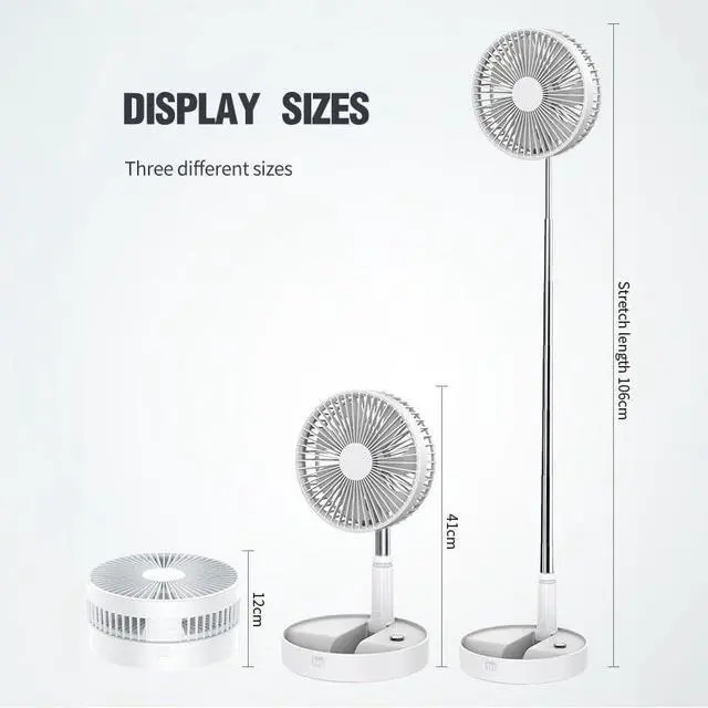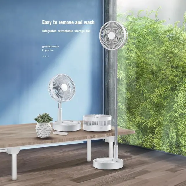 This product is a multifunctional fan with a portable, retractable, and foldable design, equipped with remote control and detachable and washable fan blades. Its appearance is simple and generous, with a solid, compact, delicate, elegant, and fashionable integrated design. It has four speed levels: gentle breeze, cool breeze, strong breeze, and natural breeze. The fan has powerful airflow, wide coverage, and low noise. The fan battery uses lithium batteries with protection boards, featuring fast cycle charging, energy-saving functions, and long battery life, allowing it to be conveniently moved and placed in any environment. Both the front grille of the fan blade kit and the fan blade can be detached and washed simultaneously, allowing your beloved fan to be refreshed at any time, suitable for office, home, and outdoor use. The product is easy to retract, fold, and store, small in size, convenient to carry around, and can be folded and stored after use without taking up space, bringing unlimited convenience and speed to your life. The fan face can be folded up and down 180 degrees, and with the 7-section telescopic aluminum rod, the height and wind angle can be adjusted at will. The fan is equipped with a 4-meter wireless remote control function for easy operation, and it also has a 1-2-3-4 hour timing function (remote control only), making it an indispensable life companion in real life.