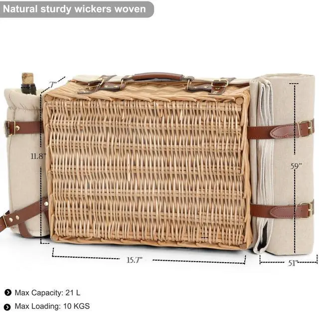 The wicker basket is constructed with all-natural willows with PU leather reinforced handle. It comes equipped with full picnic service for 4 persons.