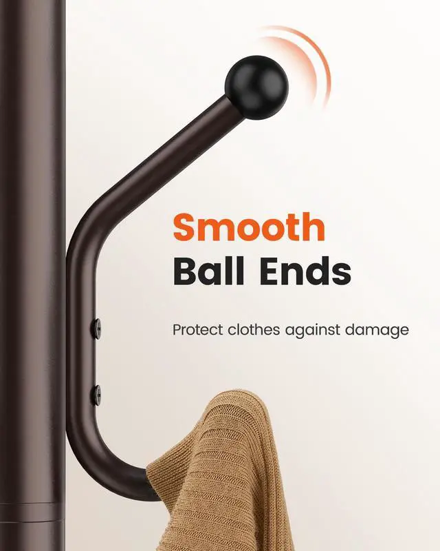 With 14 hooks, the coat hanger stand offers ample space for coats, hats, and bags. The family-friendly design allows everyone to reach items thanks to hooks at various heights. Smooth ball ends avoid snagging clothes while the durable metal frame and base supports up to 11 lbs without tipping.