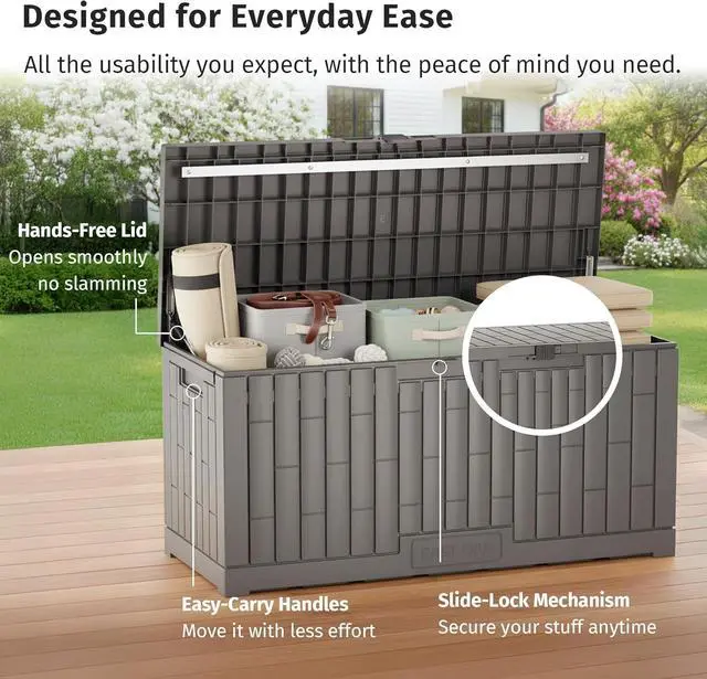 SMART FEATURES, EASIER LIFE - The hydraulic lid opens smoothly and stays up for hands-free access. Built-in handles and a dual-lock system keep gear safe from kids, pets, and theft. Doubles as seating, a side table, or indoor storage