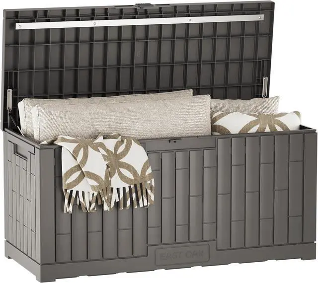 EAST OAK 120 Gallon Outdoor Storage Box | Large Resin Deck Box with Reinforced Stainless Steel Support | Waterproof & UV-Resistant Patio Storage Box for Cushions, Garden Tools & Pool Accessories, Grey