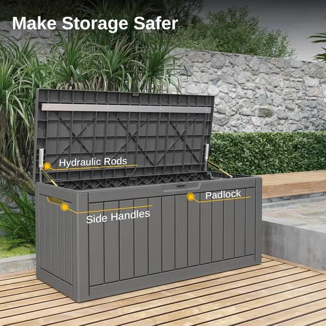 SMART FEATURES, EASIER LIFE - The hydraulic lid opens smoothly and stays up for hands-free access. Built-in handles and a dual-lock system keep gear safe from kids, pets, and theft. Doubles as seating, a side table, or indoor storage