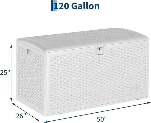 120 Gallon Waterproof Large Resin Deck Box Indoor Outdoor, Lockable Storage Container for Patio Furniture Cushions, Throw Pillows, Garden Tools, and Pool Floats, White