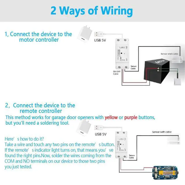 However, for garage door controllers with yellow and purple buttons, this method cannot be used because they do not output signals. Instead, you must connect the NO and COM terminals to the garage door remote control, enabling your switch to replace manual pressing of the remote and thus open/close the garage door.