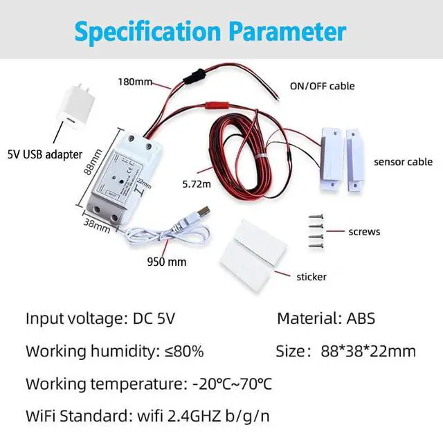 1 x Smart garage door opener, 1 x USB adapter, 1 x Door sensor with sensor wire, 4 x Screws,2 x Double-sided adhesive tapes,1 x User manual.