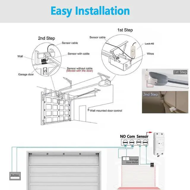 We know that a garage door can be opened and closed via a wall button. First, locate the "Push button" terminal connecting the wall switch to the controller, then connect the NO and COM terminals of wifi garage door opener remote switch to the "Push button" terminal. This creates a parallel control system, allowing the traditional wall switch to remain functional. Next, install a door magnetic sensor to read the open/closed status of the door.