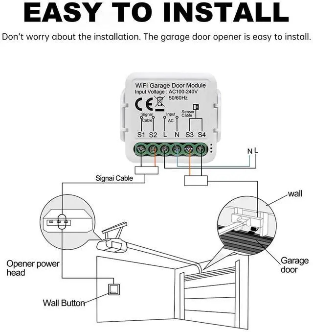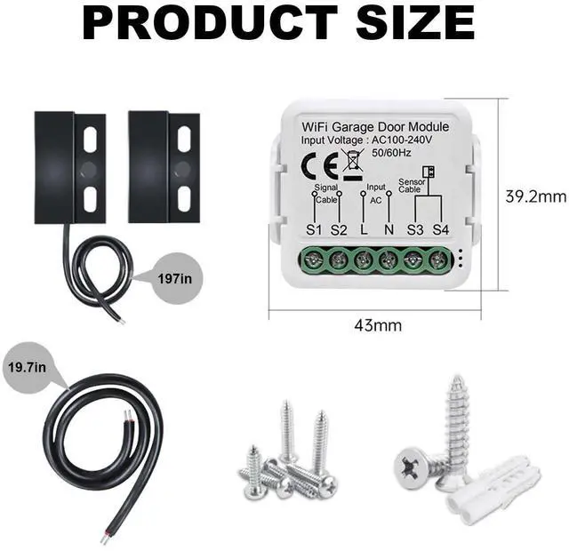The WiFi garage opener adapter needs no extra hub/hardware. Follow included step-by-step guides — most need simple wiring, installs in minutes (no pros required). It only supports 2.4GHz WiFi (not 5GHz); ensure your home has 2.4GHz signal.