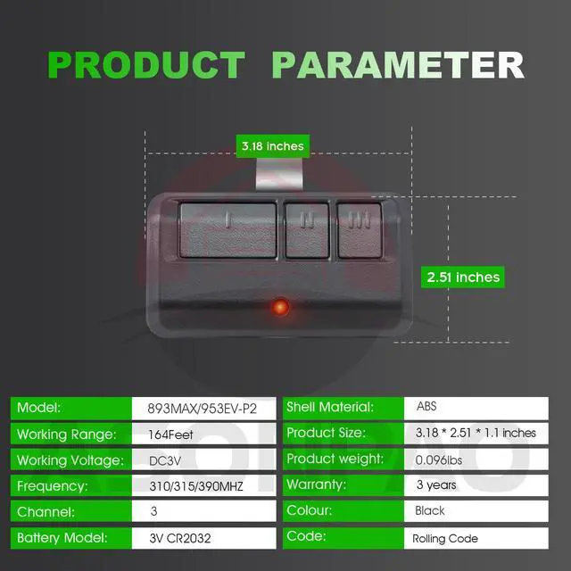 Wide CompatibilityThis LiftMaster Garage Door Opener Remote is Universal for LiftMaster/Chamberlain/Sears Craftsman Garage Door Opener with a Yellow, Purple,Red/Orange,Green Learn Button Since 1993.NOT Support Security+ 3.0 White Learn Button Opener Produced in 2026Not Support Dip Switch Opener!