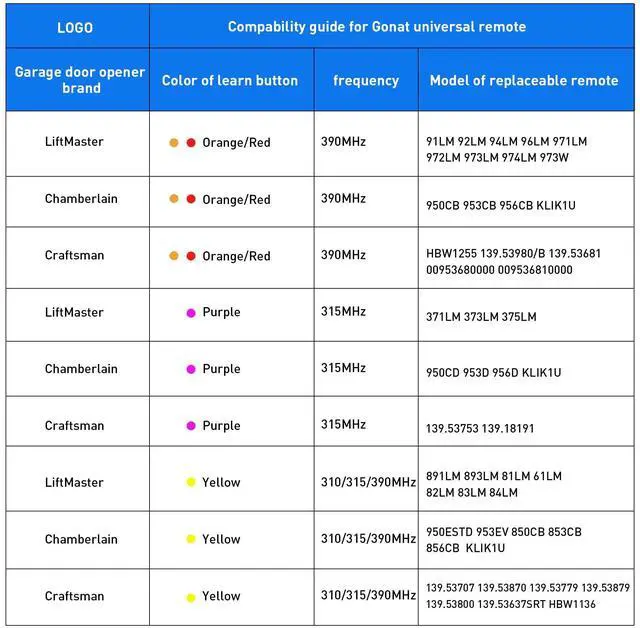 Please make sure your garage door opener has a Red/Orange/Purple/Yellow color learn button.