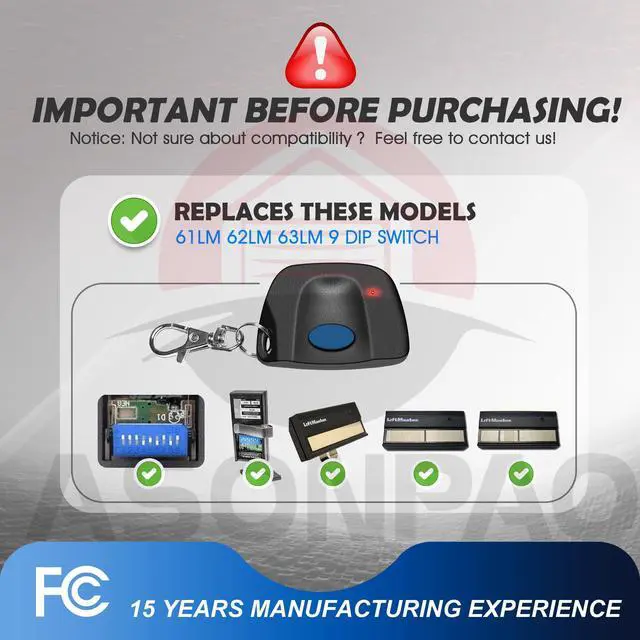 Compatible list**: ONLY Compatible with (1984 to 1993) 61LM 750CB Liftmaster/Chamberlain Garage Door Opener Remote 390MHZ 9 Dip Switch.