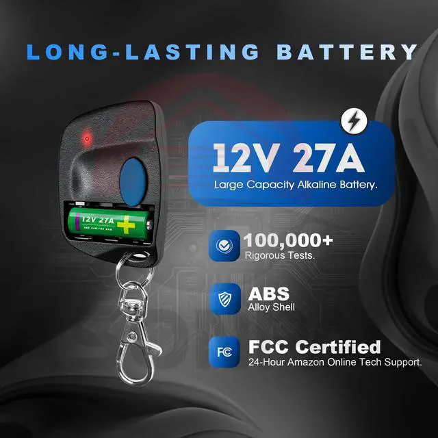 **Extend battery life**: It is powered by 12V 27A alkaline battery and smart low-power chip to ensure a longer service life and is compatible with various garage door motors.