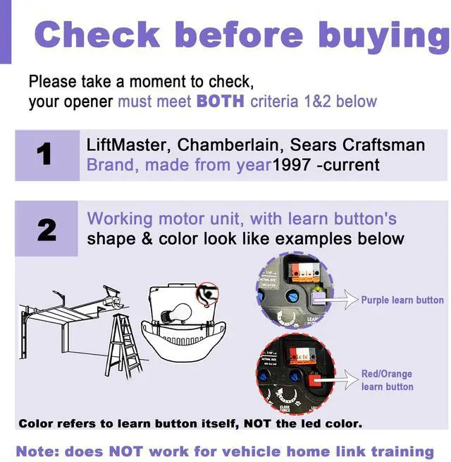 Compatible with Learn Button garage door opener with Purple/Red/Orange colors only.