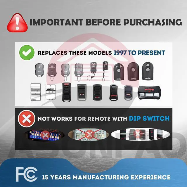Wide CompatibilityUniversal for 1997 to Present Genie & Overhead Door Garage Door Opener.Not SUPPORT DIP SWITCH OPENER