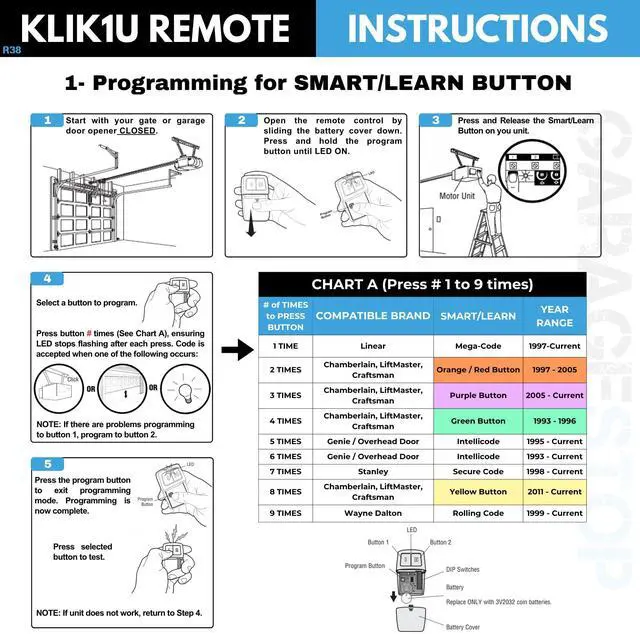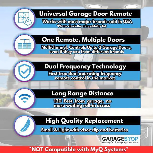 • Our universal garage door remote control is compatible with nearly all major garage door opener brands made after 1993 that utilize photo-eyes safety sensors, including Chamberlain, Genie, LiftMaster (excluding MyQ), Craftsman, and Linear. Whether you need a replacement remote or want to add an extra controller, this remote is ideal for systems using dip switches or Smart Learn technology. NOT COMPATIBLE: Allstar, Marantec, Hormann or Liftmaster MyQ type openers. With support for garage remotes using 7- 12 dip switch garage door remote and fixed or rolling code systems, this clicker garage door opener remote ensures flexible operation across your home or gate setups.