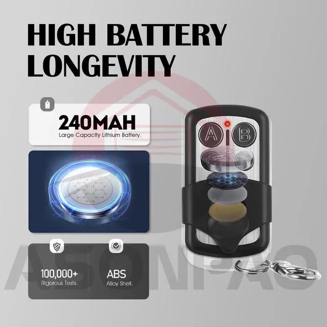 **Durable & Reliable Performance**: FCC certified and tested over 100,000 times, this garage door opener remote features a robust ABS alloy casing, designed to withstand drops and deliver long-lasting reliability.