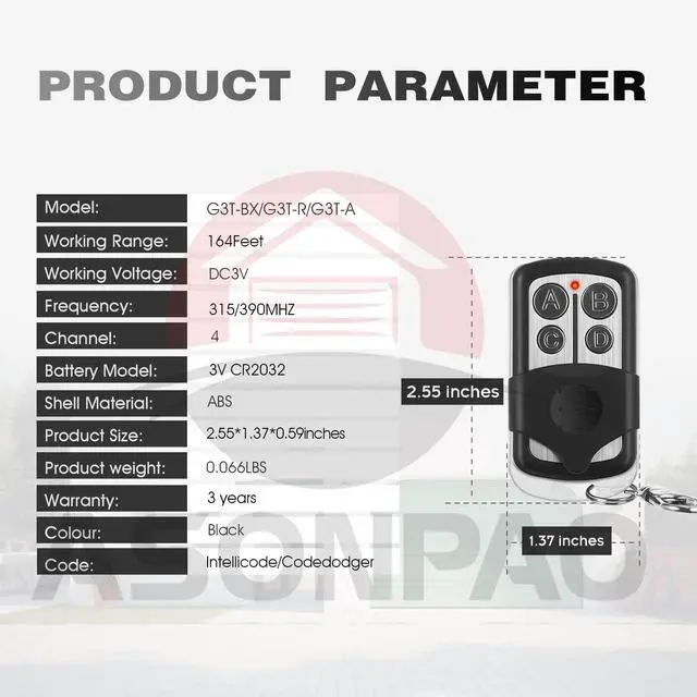 **Long Battery Life**: Equipped with a 240mAh lithium battery and a third-generation intelligent low-power chip, this remote ensures extended battery life and excellent compatibility with various garage door motors.