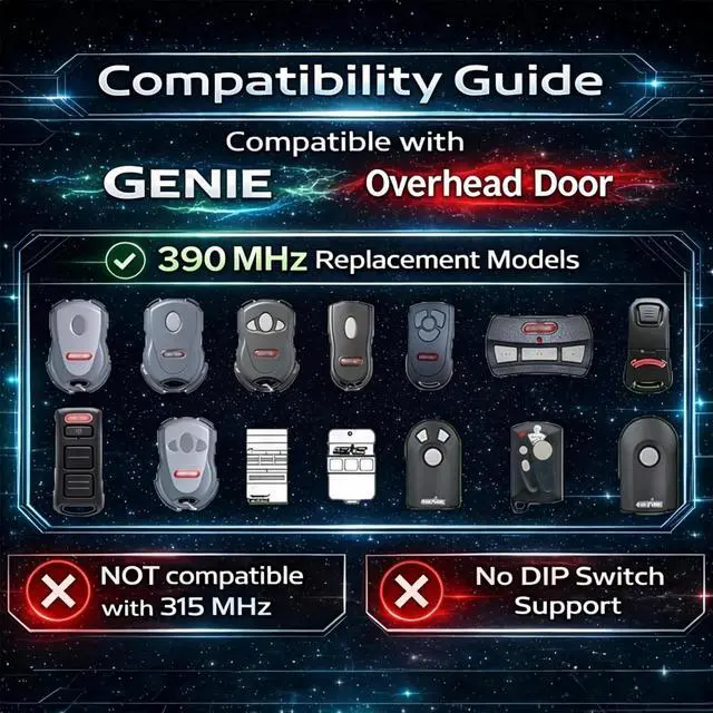 IMPORTANT: Works with Genie & Overhead openers (390 MHz) that use a "Learn" button. Please check your model before ordering. This remote is NOT compatible with openers that use DIP switches.