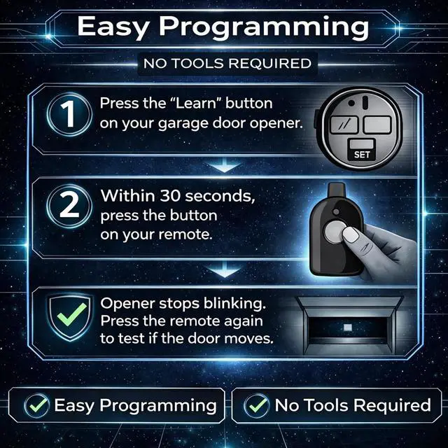 Step 3: Press the remote button repeatedly-typically just twice more. Your garage door will activate, confirming the pairing is complete.