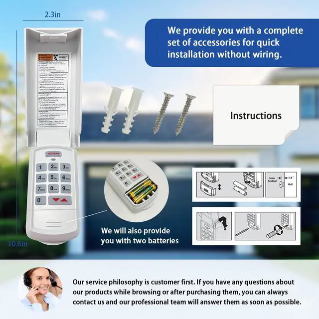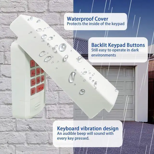 | New Upgrade Function | It can extend the time for one click shutdown function. | Replacement For Linear Megacode MDTK 318MHZ keypad. | You also can learn about the password anti tailgating function and emergency braking function through the manual. | This genie garage door opener keypad will operate up to 3 doors with only one pin number. | If an obstruction breaks the light beam while the door is closing, the door will stop and reverse to the full open position. | Effectively reduce the interference and impact of sunlight and weather on garage door sensors, ensuring that the sensors can be used normally. |
