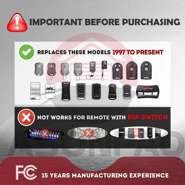Wide CompatibilityUniversal for Overhead Door Legacy Python Odyssey Destiny Phantom Garage Door Opener Since 1997.NOT SUPPORT DIP SWITCH OPENER