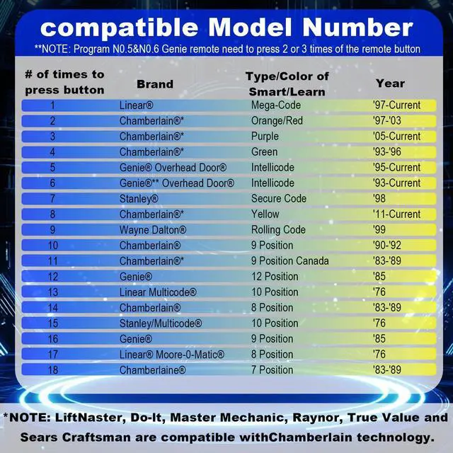 | Chamberlain | 740CB, 750CB, 756CB, 850CB, 853CB, 856CB, 940CB, 940CD, 940D, 950CB, 950CD, 950D, 953CB, 953CD, 953D, 956CB, 956CD, 956D, 940EV, 950EV, 953EV, 956EV, KLIK1U, KLIK2U, KLIK5U, 940ESTD, 950ESTD, 953ESTD, CLT1, CLK1, MC100///41A3###,41A4###,41A4###, 41A5###, 41AB####, 41AC####, 41AS####, 41A7### |