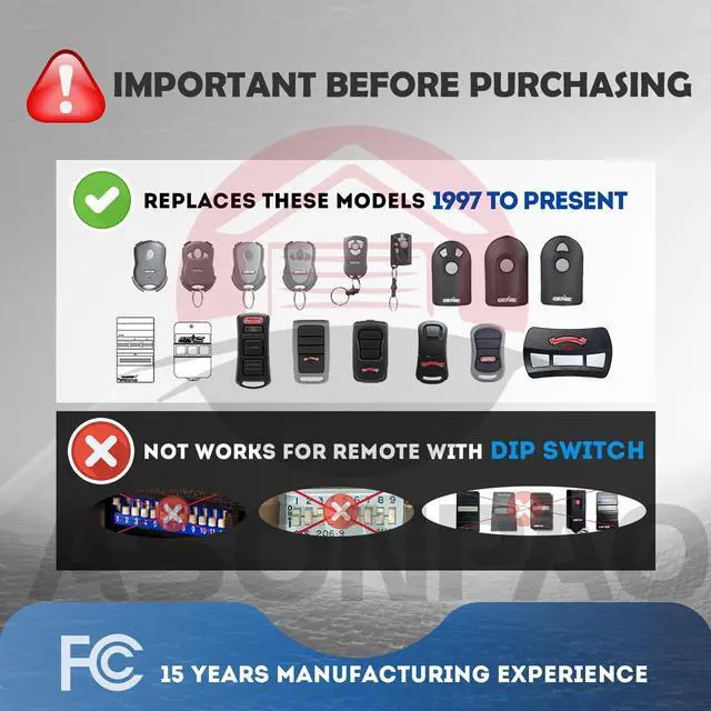 Wide CompatibilityUniversal for Genie & Overhead Door Garage Door Opener Since 1997.Not SUPPORT DIP SWITCH OPENER