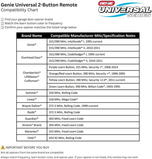 | Xtreme Brand | 303 MHz, Fixed Learn Code |