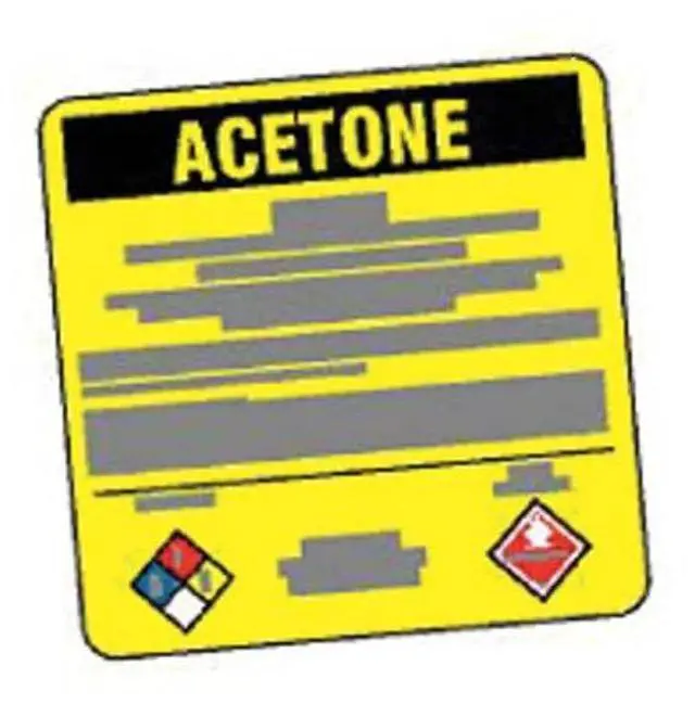 NFPA Label, Hazard Communication Standard NFPA, Header ACETONE, Height 5 in, Laminated Yes, Language English, Legend/Background Color Blue, Red, White, Black/Yellow, Material Polyester, Self-Adhesive Yes, Shape Rectangle, Width 5 in, Package Quantity 25. This item has been restricted from sale in the following state (s): []