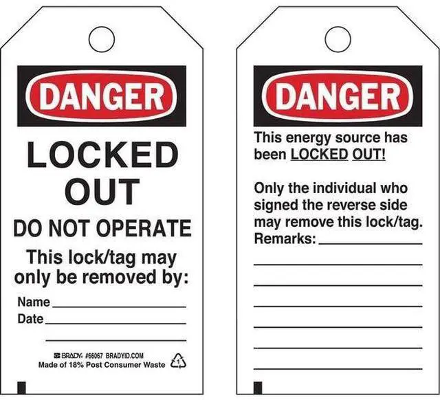 Danger Tag, Material Polyester, Legend Locked Out Do Not Operate This Lock/Tag May Only Be Removed By, Height 5 3/4 in, Width 3 in, Withstand Pull Force 75 lb, Hole Size 3/8 in, Header Danger, Legend Color Black, Background Color White, Legend Style Text, Write on Surface Yes, Package Quantity 25. This item has been restricted from sale in the following state (s): []