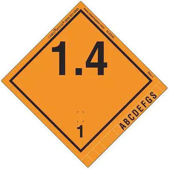 California Proposition 65: This product contains a chemical known to the State of California to cause birth defects or other reproductive harm. Explosive 1.4 International, Package Quantity 500, Hazard Class Class 1 (Explosives), DOT/UN Product Form Label, Message Explosive 1.4 w//LetterTabs, Label Width 4 in, Label Height 3 15/16 in, Material Vinyl, Package Quantity 500. This item has been restricted from sale in the following state (s): []