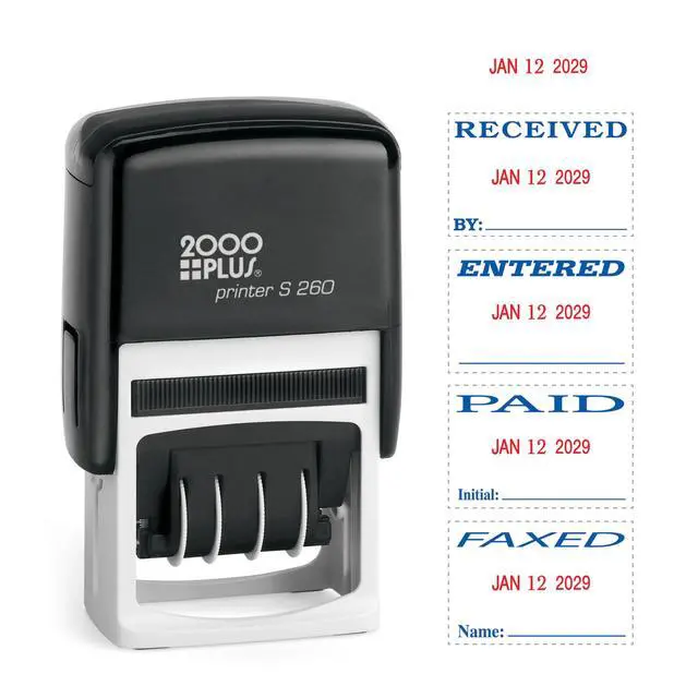 Combine date and phrase for efficient stamping. Common business phrases included. Use either year or phrase. Four-band date: months, days and five-year band. Self-inking dater with plastic frame. Type size 1.5.