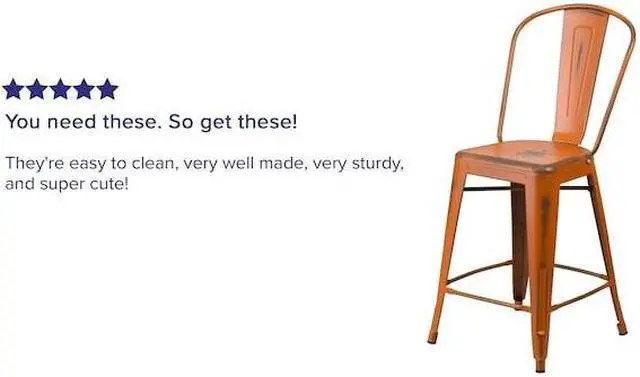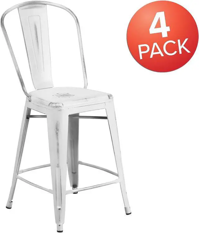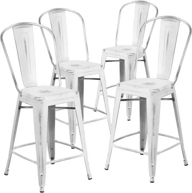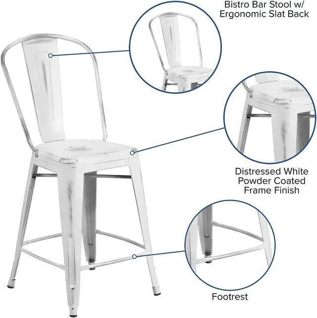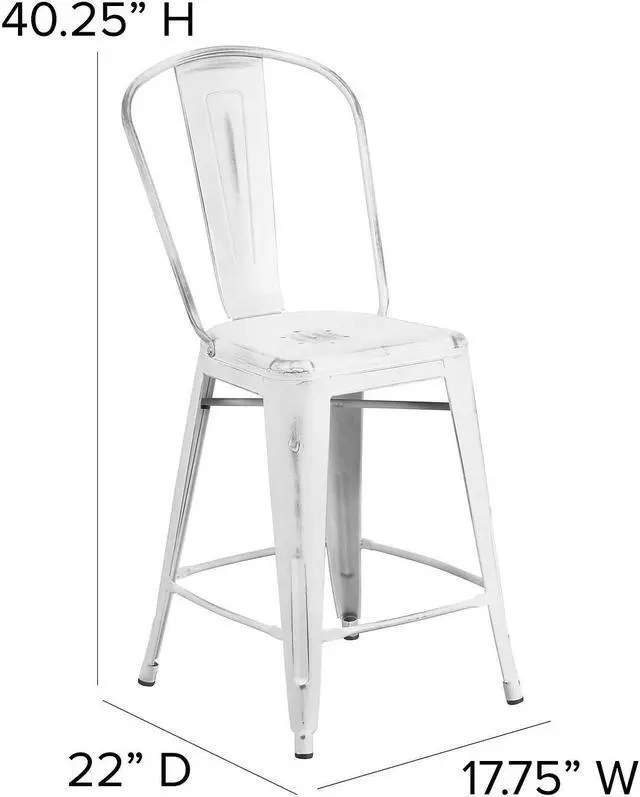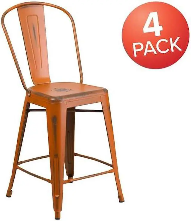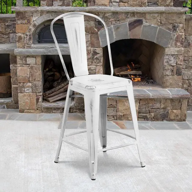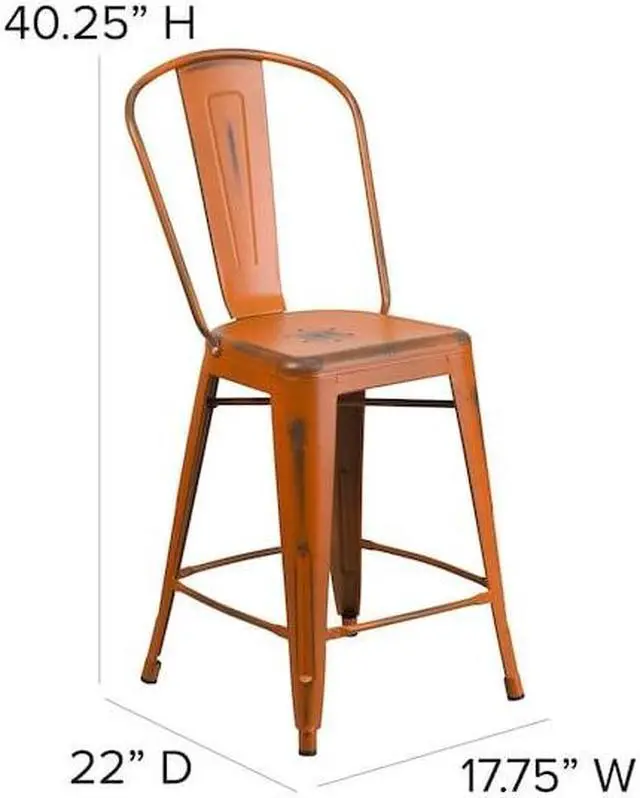 Create your own breakfast nook in the kitchen or jazz up your kitchen island with this trend-setting metal stool that will make a great addition to your kitchen, dining room or restaurant. You'll be pleasantly surprised how well these distressed metal counter stools blend in with your existing furnishings. Constructed to hold up in commercial settings, this dining counter stool will instantly modernize your restaurant, cafe, or bar by adding splashes of color. Metal counter stools with backs provide a comfortable sitting experience, the full back is ergonomically curved and includes a vertical slat. The lower support braces double as a footrest, promoting proper posture and an improved sitting experience. Update your employee breakroom with some colorful furniture or add durable seating to your patio furniture collection with this indoor outdoor counter height bar stool. For longevity, care should be taken to protect from long periods of wet weather.