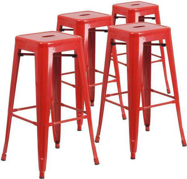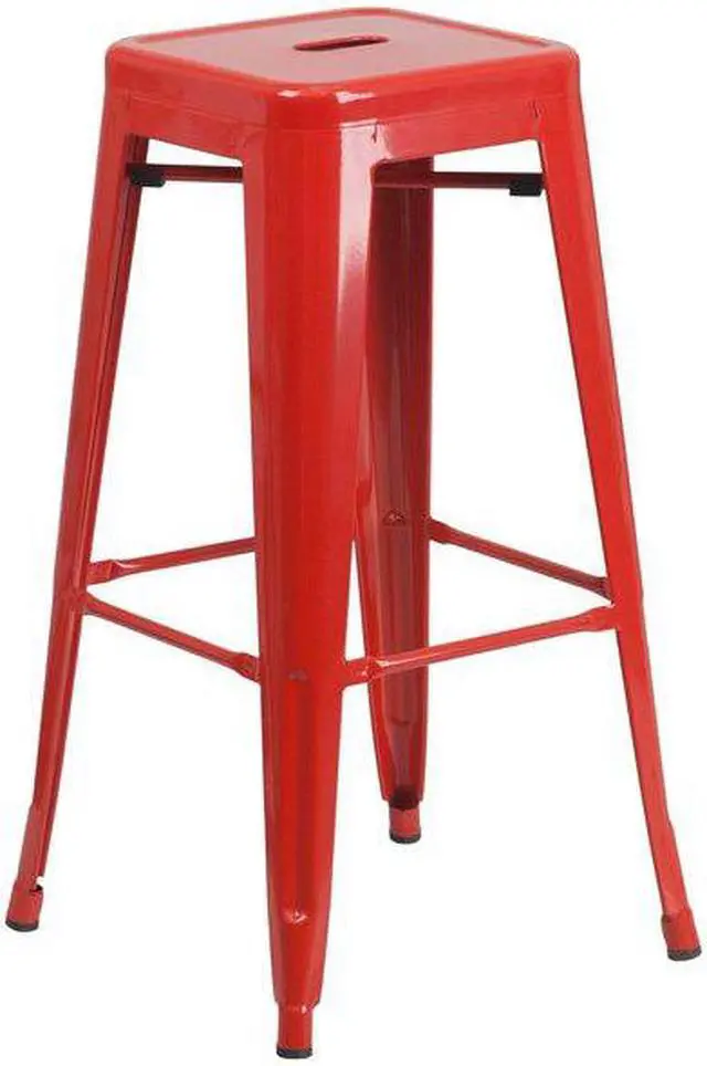 Let the clean lines and simple design of this square, industrial style barstool add a modern appearance to your home or business with this colorful bar height stool. This space-saving stool is stackable making it great for storing. This stool features a backless, lightweight design that is easy to move from your dining room to the patio or sidewalk. A cross brace underneath the seat adds extra stability and features plastic caps that prevent the finish from scratching when stacked. The lower support brace doubles as a footrest and protective floor glides prevent damage to flooring. This all-weather use stool is great for indoor and outdoor settings. For longevity, care should be taken to protect from long periods of wet weather. The unique design of this backless stool gives it the versatility to be used in multiple spaces.