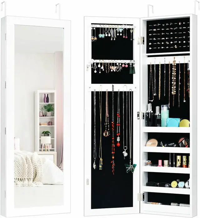 This is our elegant door hanging jewelry cabinet, which is perfect for organizing and storing your favorite rings, necklaces, bracelets. Made of high-quality MDF, this jewelry cabinet is sturdy and sturdy. It is equipped with a big mirror and owns a powerful storage capacity. For its built-in different compartments and separate hooks, you can save your favorite accessories safely and in an organized manner. It makes it easy to choose your jewelry in the morning without the frustration of looking for loose or missing pieces. Organize valuables and display an elegant furniture in your home.