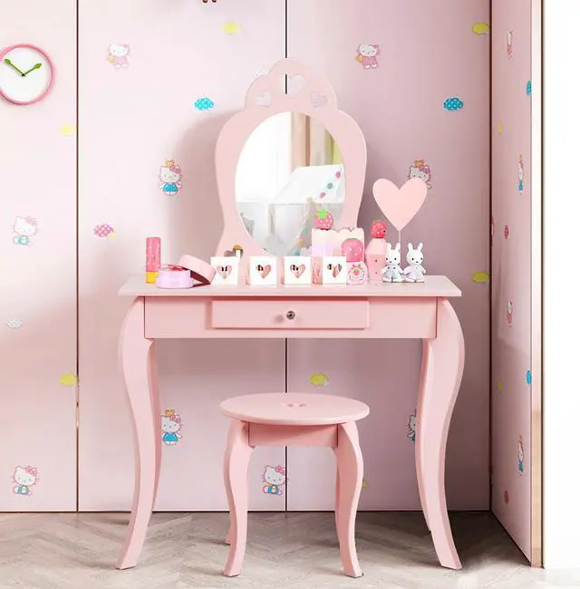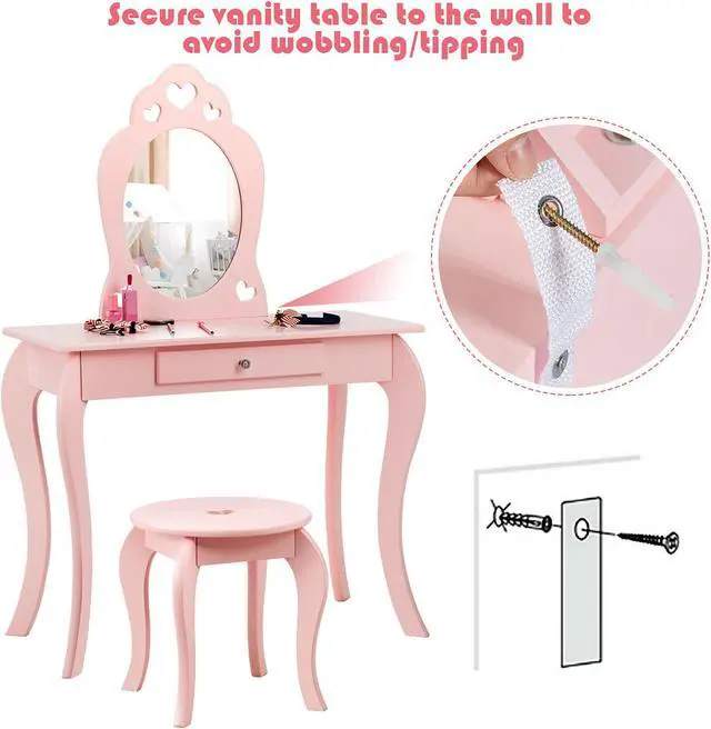 Are you wondering what to give your kids as birthday or Christmas gift? Our vanity set is a perfect present for little girl. Made of density board and pine wood, this whole set is very stable and can be used for long time. In addition, rounded corners and anti-slip pads are just some of the ways that we made our vanity set safe for your kids. Designed with wall anchor strap, the table is not easy to tip over. The dresser also has a drawer to help store small items such as hair ties, brushes, makeup, nail polish and other fun trinkets. What's more, the stool can provide comfortable sitting experience for your little one. Bring our set today and give your little one a big surprise!