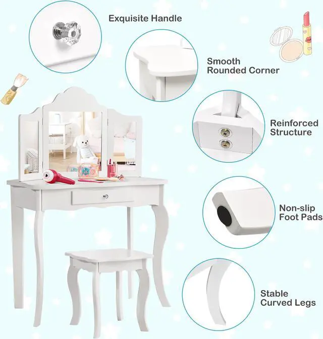 Each girl is a princess, Give your daughter a funky place to get beautified and indulge in the latest of fashion with this vanity table set.This white child dressing table set is your best choice, The table equipped with a center mirror and two 180°folding mirror which will lets your princess admire her beauty from any angle. One big drawer and smooth tabletop provide enough space to place the jewelry ,cosmetics and knick-knacks. High quality MDF construction provides maximum strength and durability. And round corner design guarantee your child's safe.