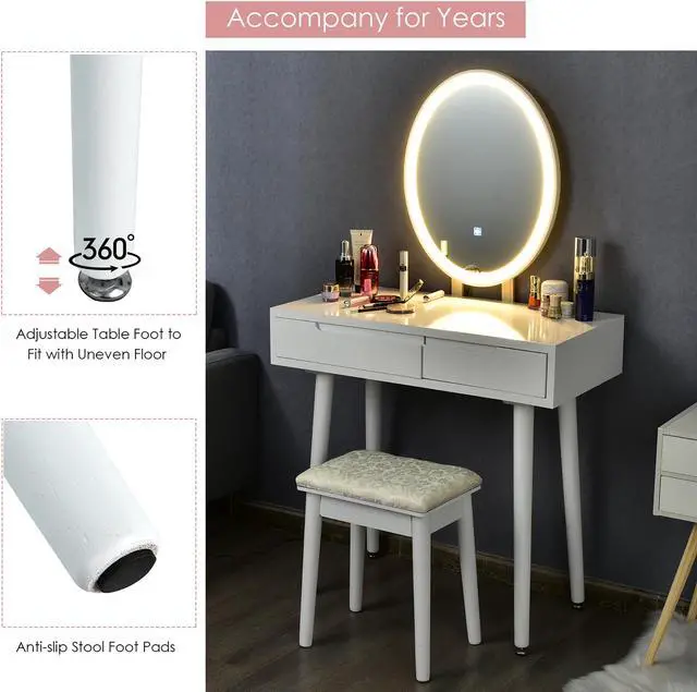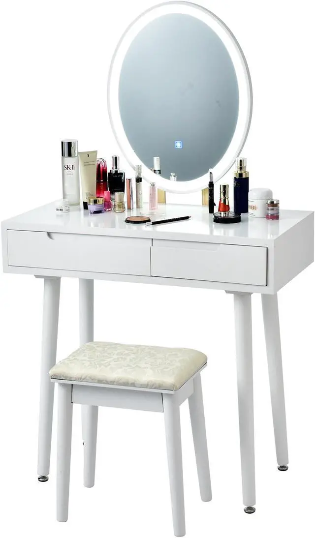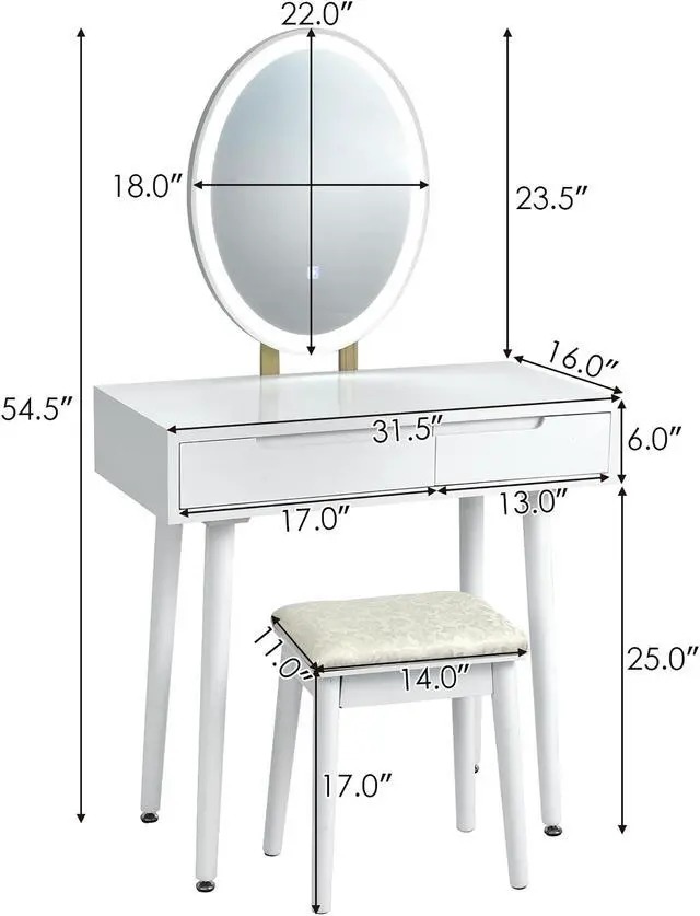Simple lines and gently polished legs give transitional grace to the vanity table set. It is an ideal choice for those who are purchasing for fashion and practical function. Two drawers are designed in different sizes, one for your beauty tools, the other for your small items like cosmetics and jewelries. The LED lights give many angles to help perfect your look.
