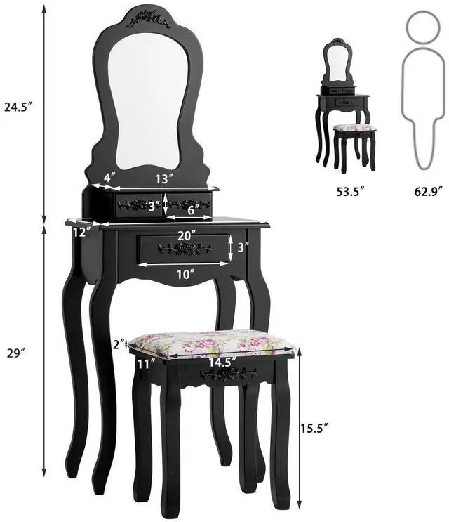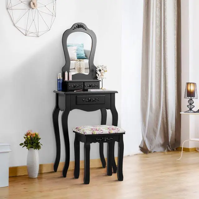Every girl wishes to have a glamorous dressing table with all her jewelry and make up. Don't hesitate, let us come your princess dream true. This vanity table set comes with mirror, stool and 3 storage drawers. Powerful storage capacity is great for storing all your jewelry. A smooth Removable tabletop provides space for cosmetics and beauty supplies. Elegant look compares well with your furniture, perfect to use in your bedroom. Do not miss our this dressing table